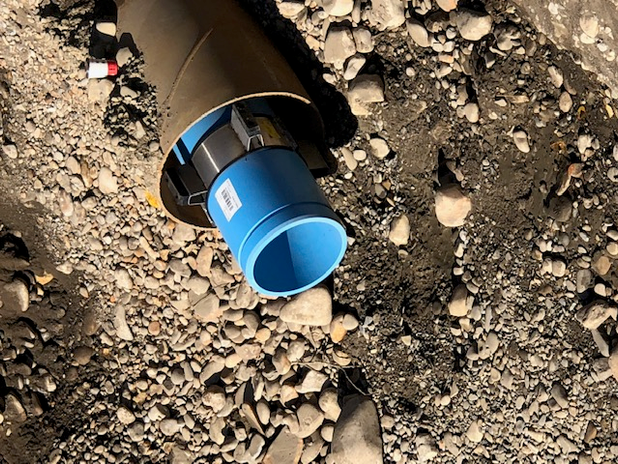 This project was completed at approximately 5m depth in pit run conditions. The installation method chosen due to the tough ground conditions was pipe ramming. Three crossings were required to complete the water loop, 30” casing was used to encase a 400mm water line to complete the towns water supply loop. Our installations crossed a highway, a creek bed and an environmentally sensitive area, all within the town limits. Combine tough ground conditions with the high water table in the area amounted to some challenging working conditions. Our crew with the support of the prime contractor managed to control the inflow of water into the excavations as well as flowing water through the casing being installed. Large volume water pumps were employed to control the water flowing in from all sides of the excavation and a large diameter pig was used to hold water back in the casing during the welding of each casing section, then removed prior to applying the percussive force of the pipe ramming tool.
